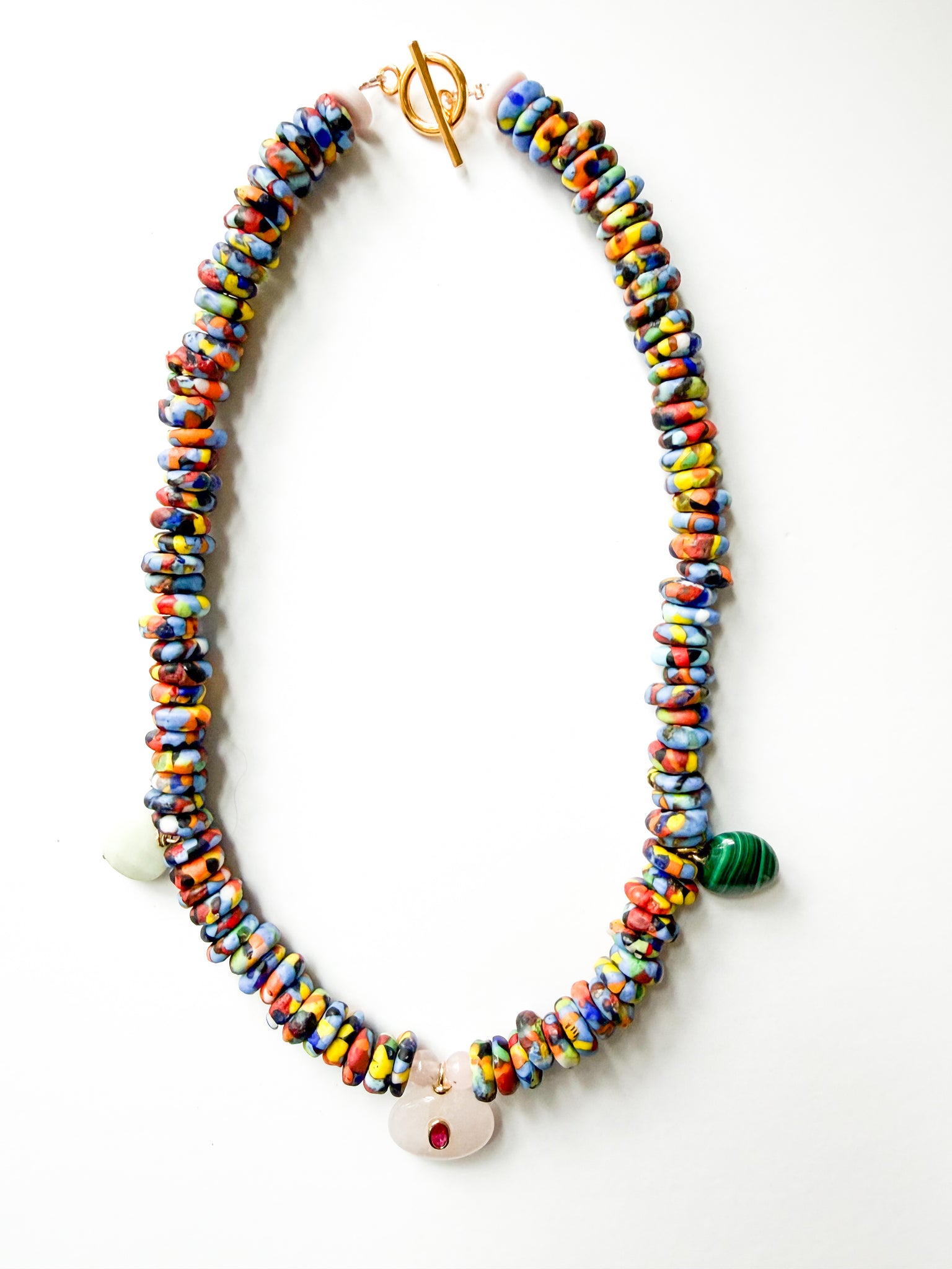 Handcrafted with a mix of colored African glass and gemstone charms. Finished with a toggle clasp. Measures approximately 20 inches.
