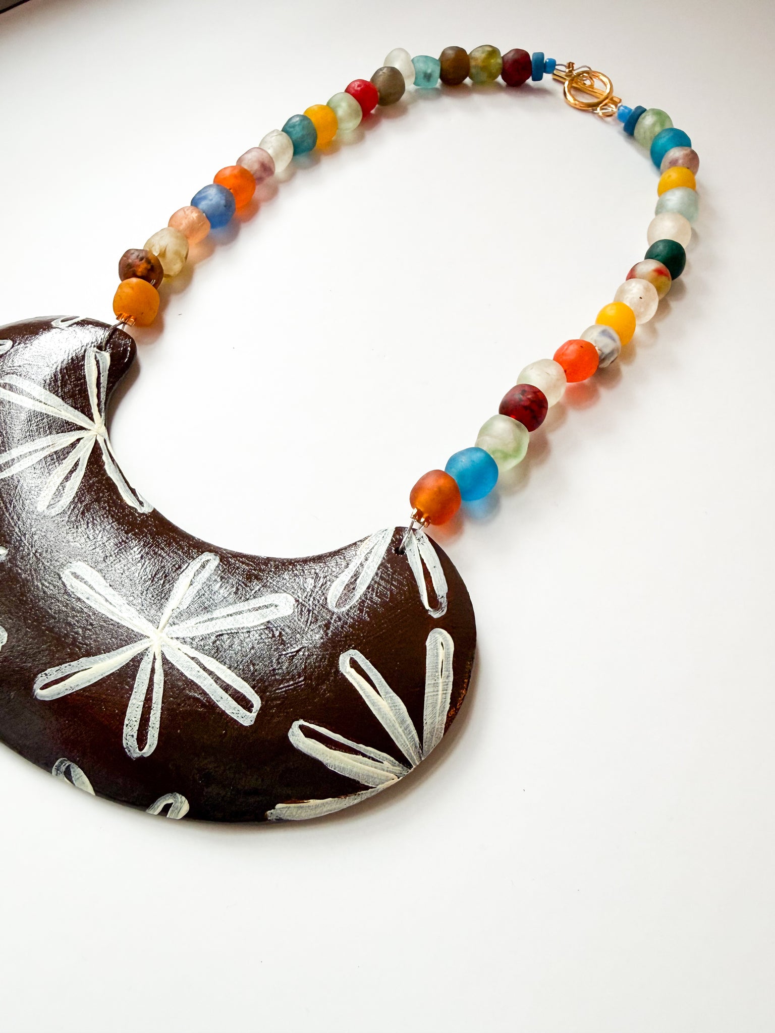 This necklace was designed in collaboration with Katlyn Ann Art. It features a hand-painted wood pendant with recycled glass beads. This piece measures approximately 22". We hope you love it!