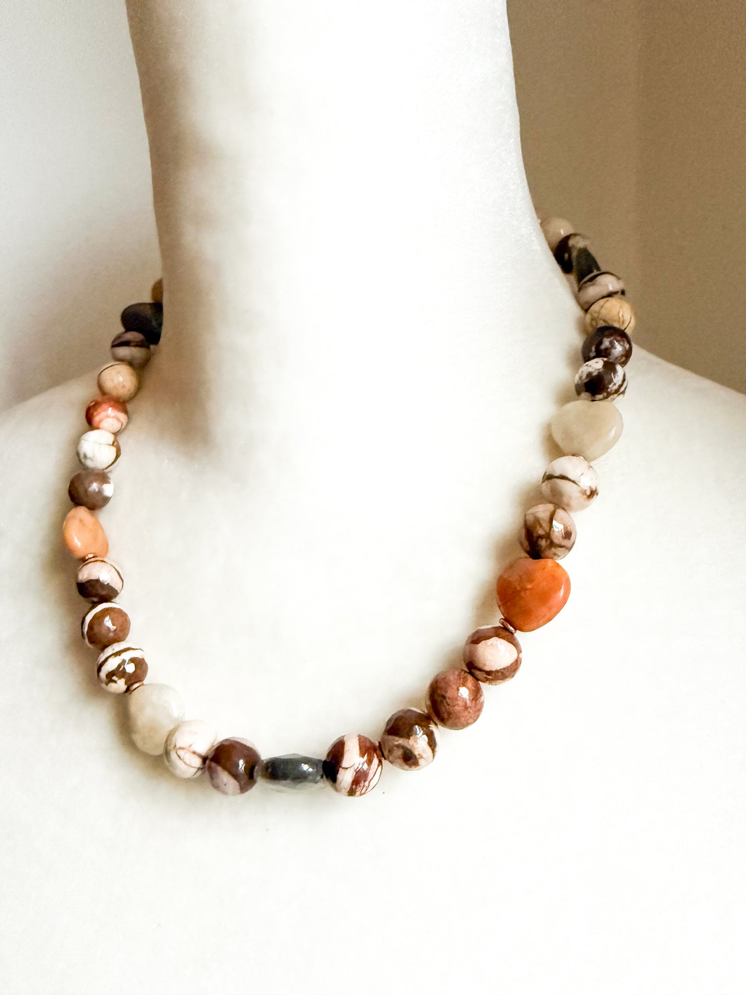 Handcrafted with a curated mix of natural stone beads in warm earth tones, showcasing organic variation in color and pattern. Finished with subtle gold accents and a toggle clasp. Measures approximately 18 inches.