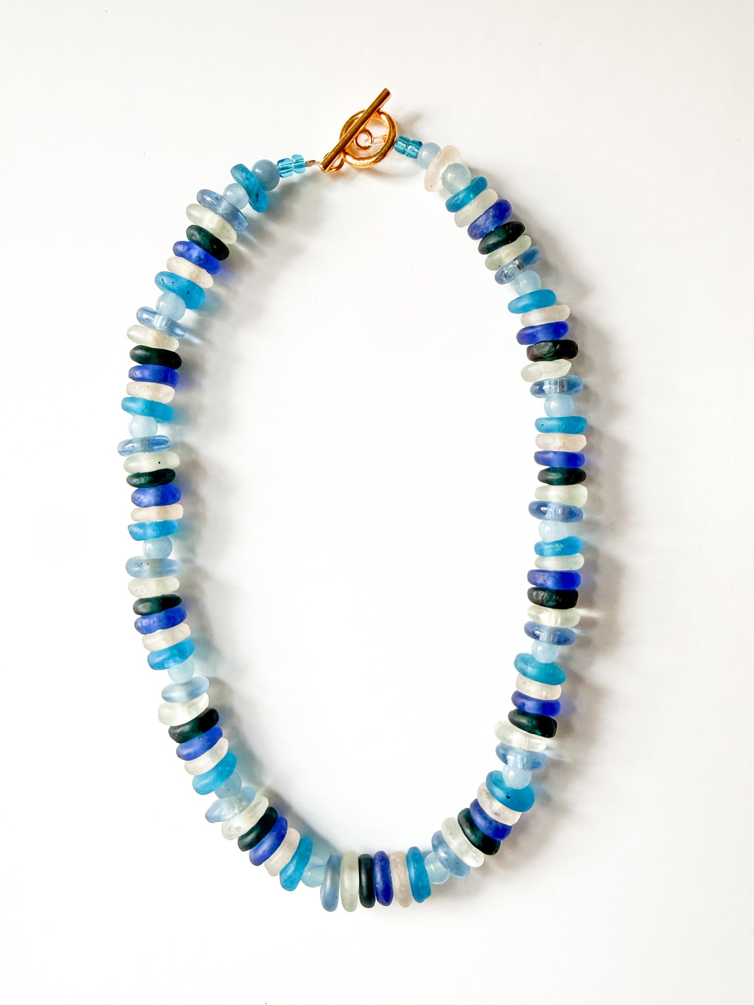This beaded necklace is handcrafted using recycled glass discs and gemstones. This piece measures approximately 20".