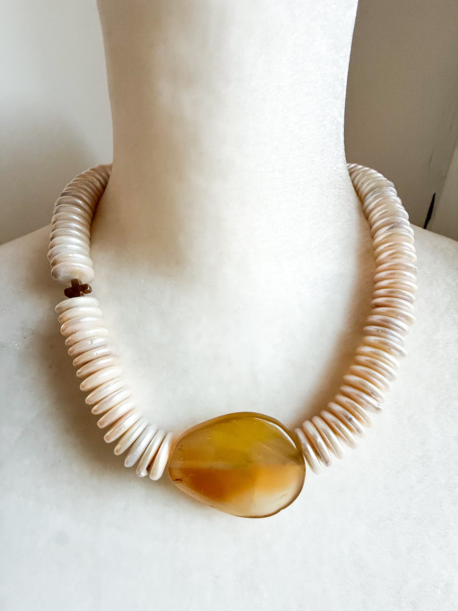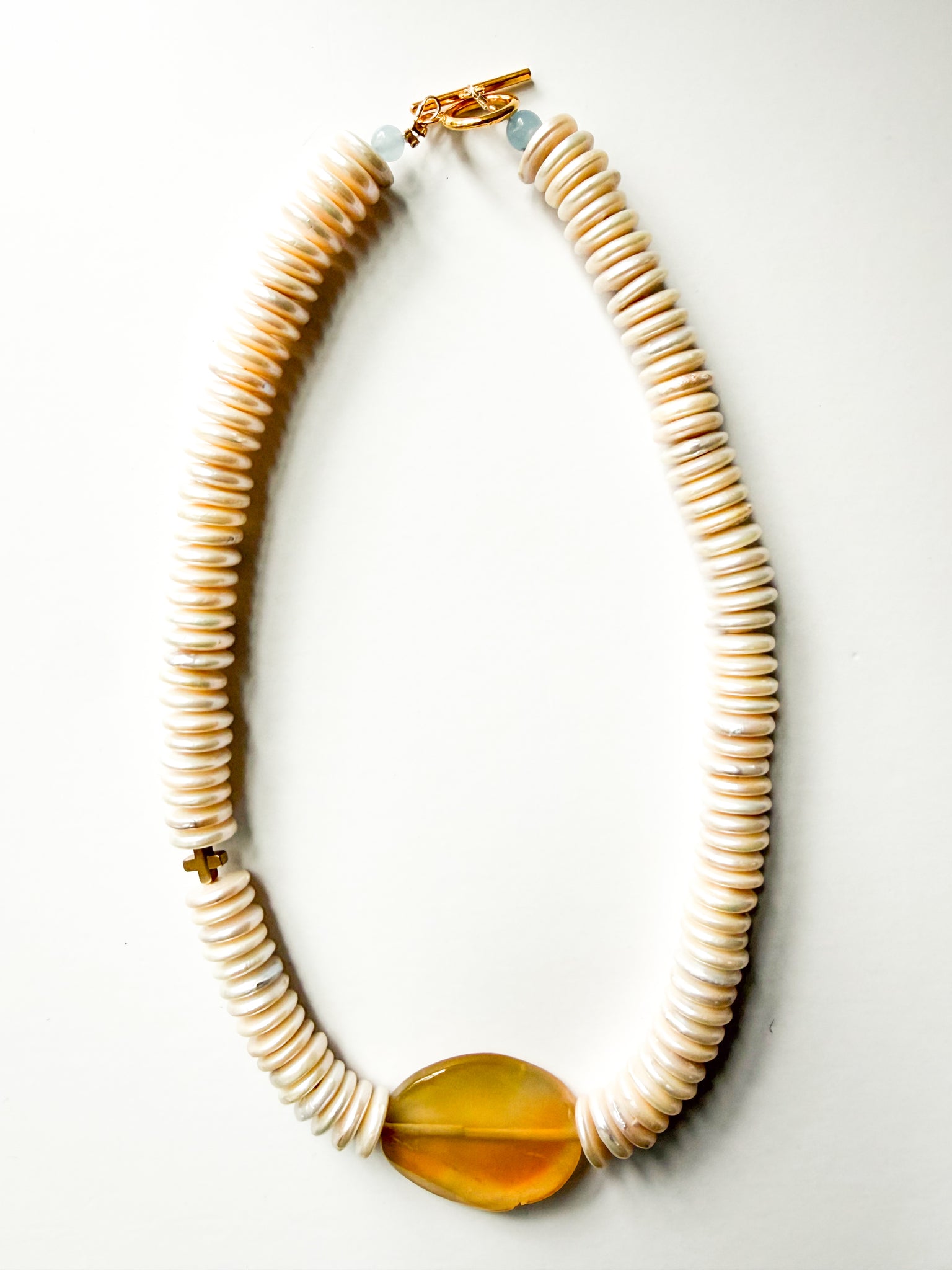Handcrafted with a balanced mix of freshwater pearl discs, gemstones, with brass accents. Finished with a toggle clasp. Measures approximately 20 inches.