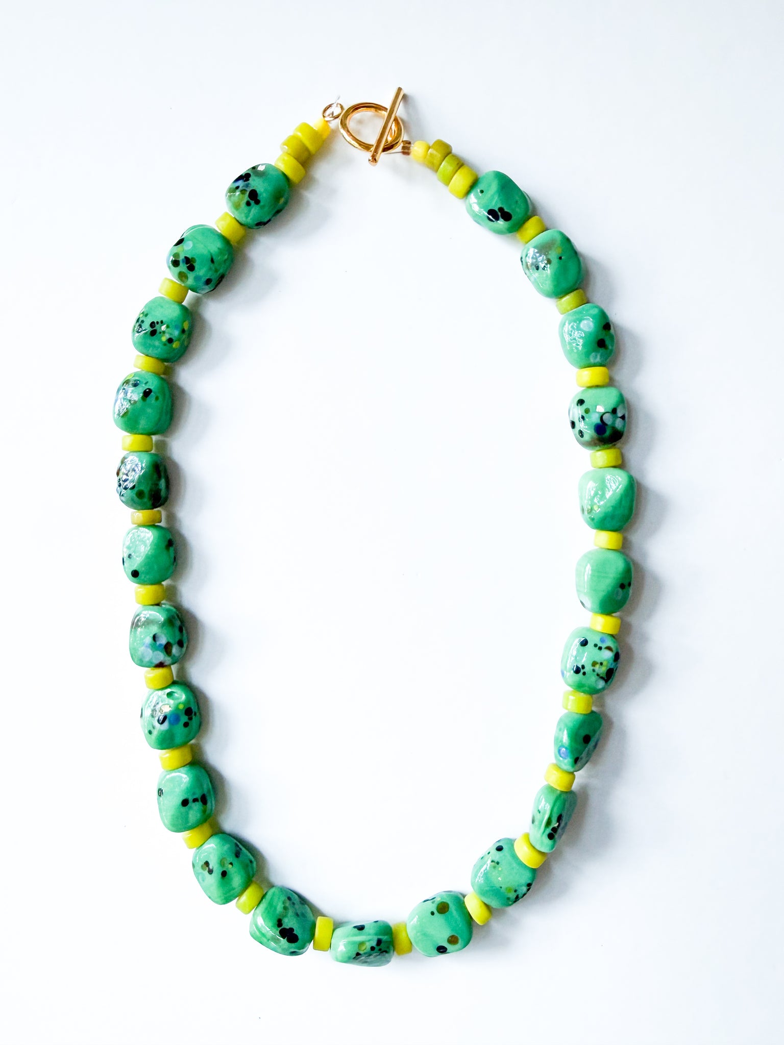 This beaded necklace is handcrafted using glass beads of two varieties. This piece measures approximately 22".