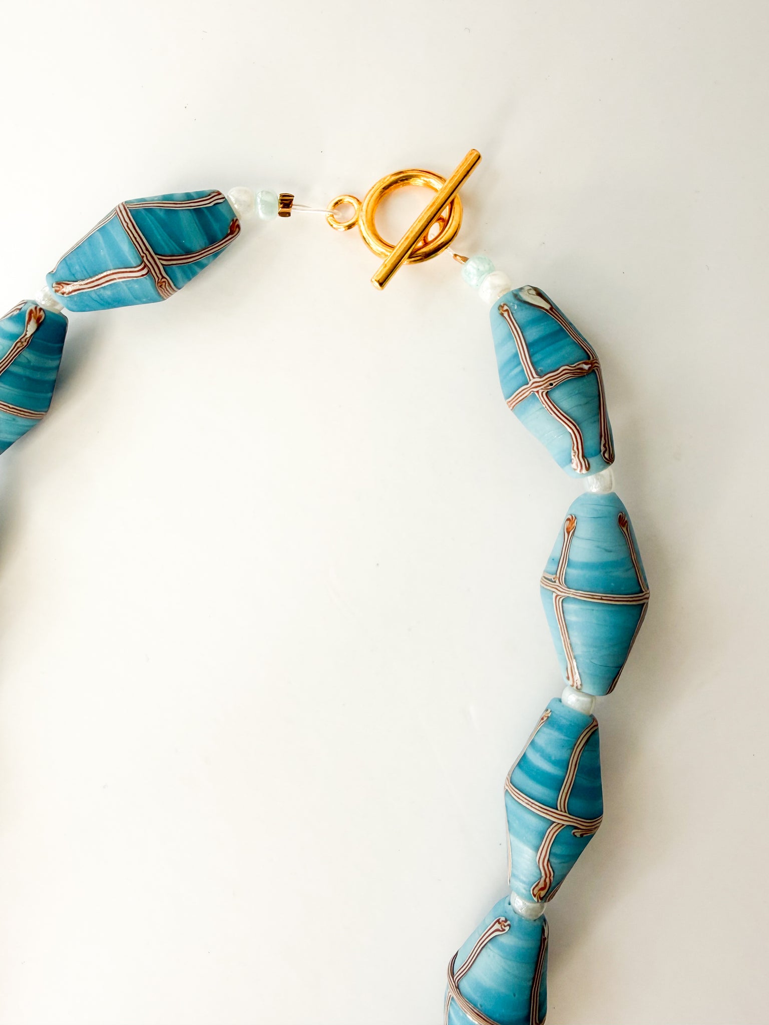 This beaded necklace is handcrafted using recycled beads and seed beads. This piece measures approximately 20".