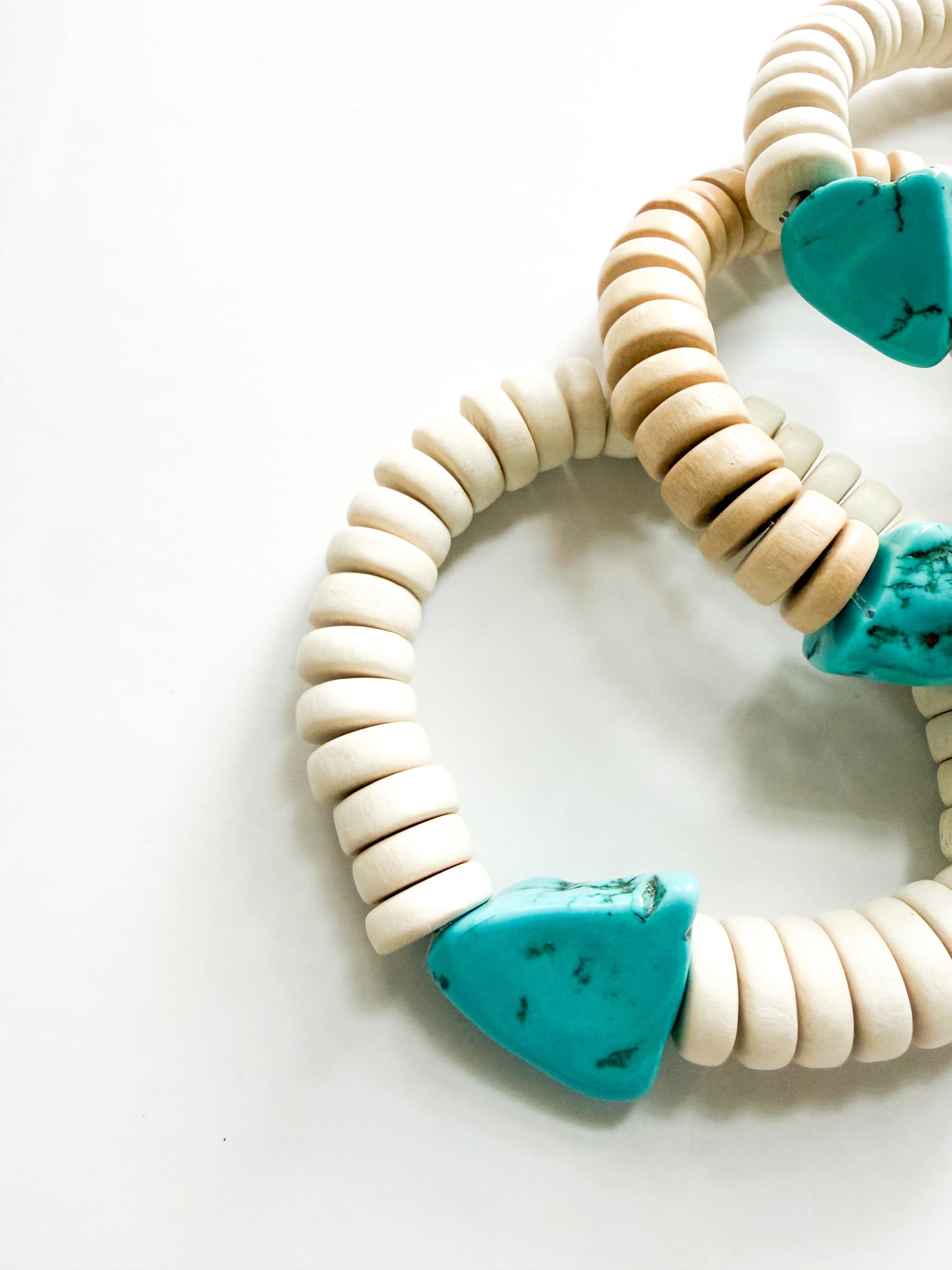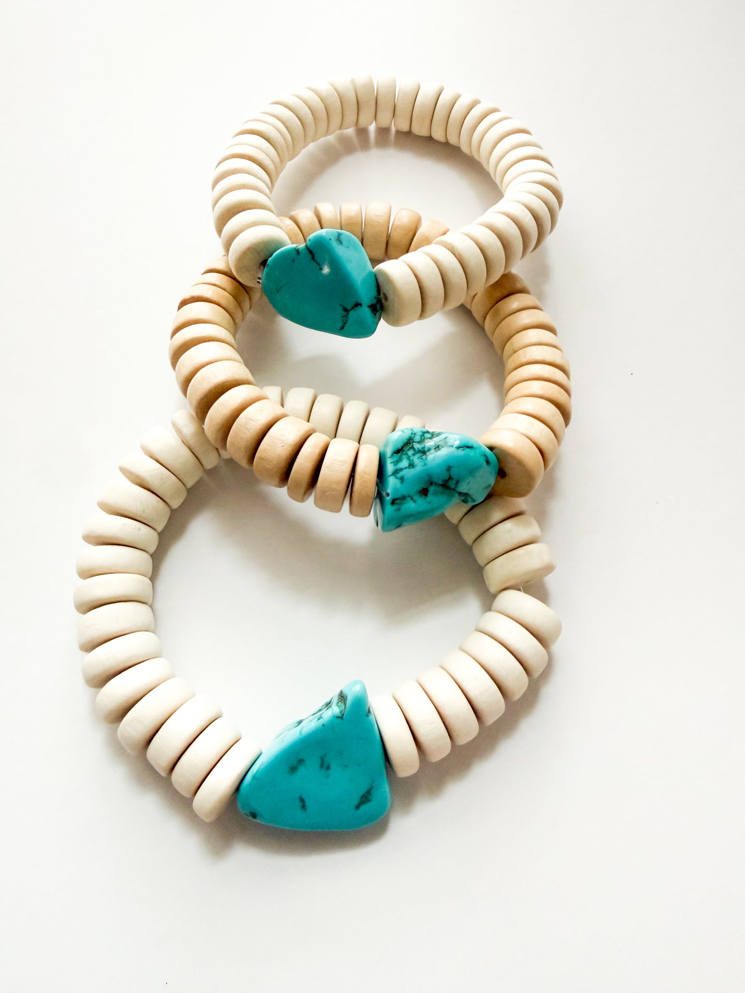Handcrafted with natural wood beads and marbled turquoise stones. Designed for everyday wear. Each piece is one of a kind. Stretch fit. Measures approximately 8".