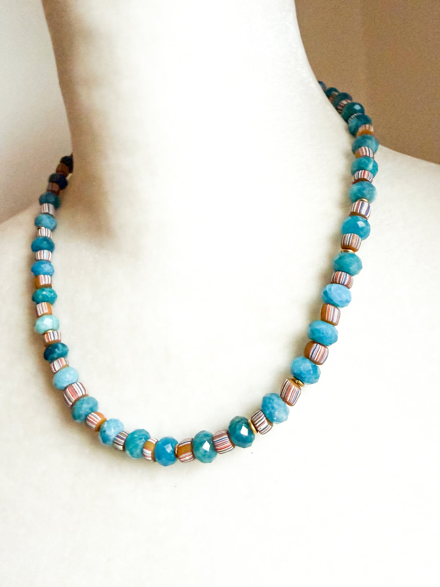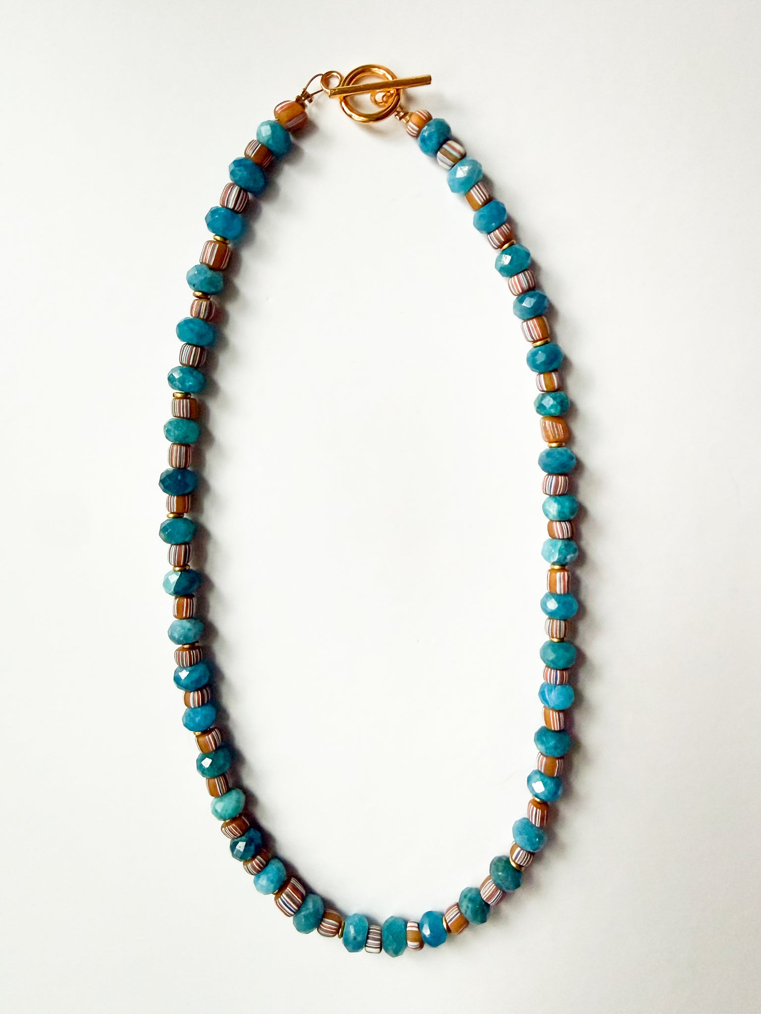 Handcrafted with faceted turquoise-hued gemstone beads paired with vintage striped beads for contrast and texture. Finished with subtle gold accents and a toggle clasp. Measures approximately 18 inches.